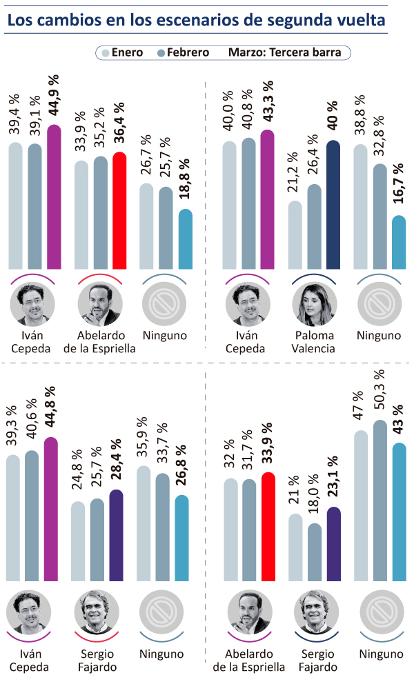 Los resultados revelan una contienda reñida, donde ninguna candidatura logra despegar de manera definitiva para ganar en primera vuelta. Sin embargo, en escenarios de segunda vuelta, Cepeda aparece con una leve ventaja en la mayoría de escenarios.