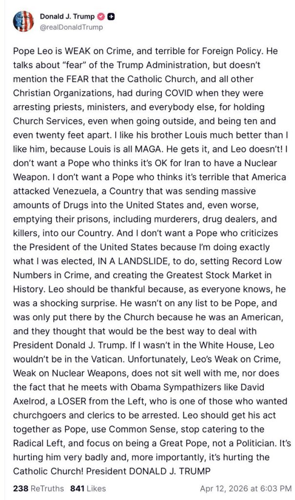 El presidente Trump se había referido al Papa León XVI diciendo: “No quiero un Papa que crea que esté bien que Irán tenga un arma nuclear. No quiero un Papa que crea que es terrible que América haya invadido Venezuela (…) No quiero un Papa que critique al presidente de los Estados Unidos, porque estoy haciendo exactamente aquello para lo que fui elegido POR UNA APLASTANTE MAYORÍA“, comentó Trump en su perfil de Truth. Luego, hablando con los periodistas, prosiguió: “No creo que esté haciendo un muy buen trabajo. No soy un gran admirador del papa León”.